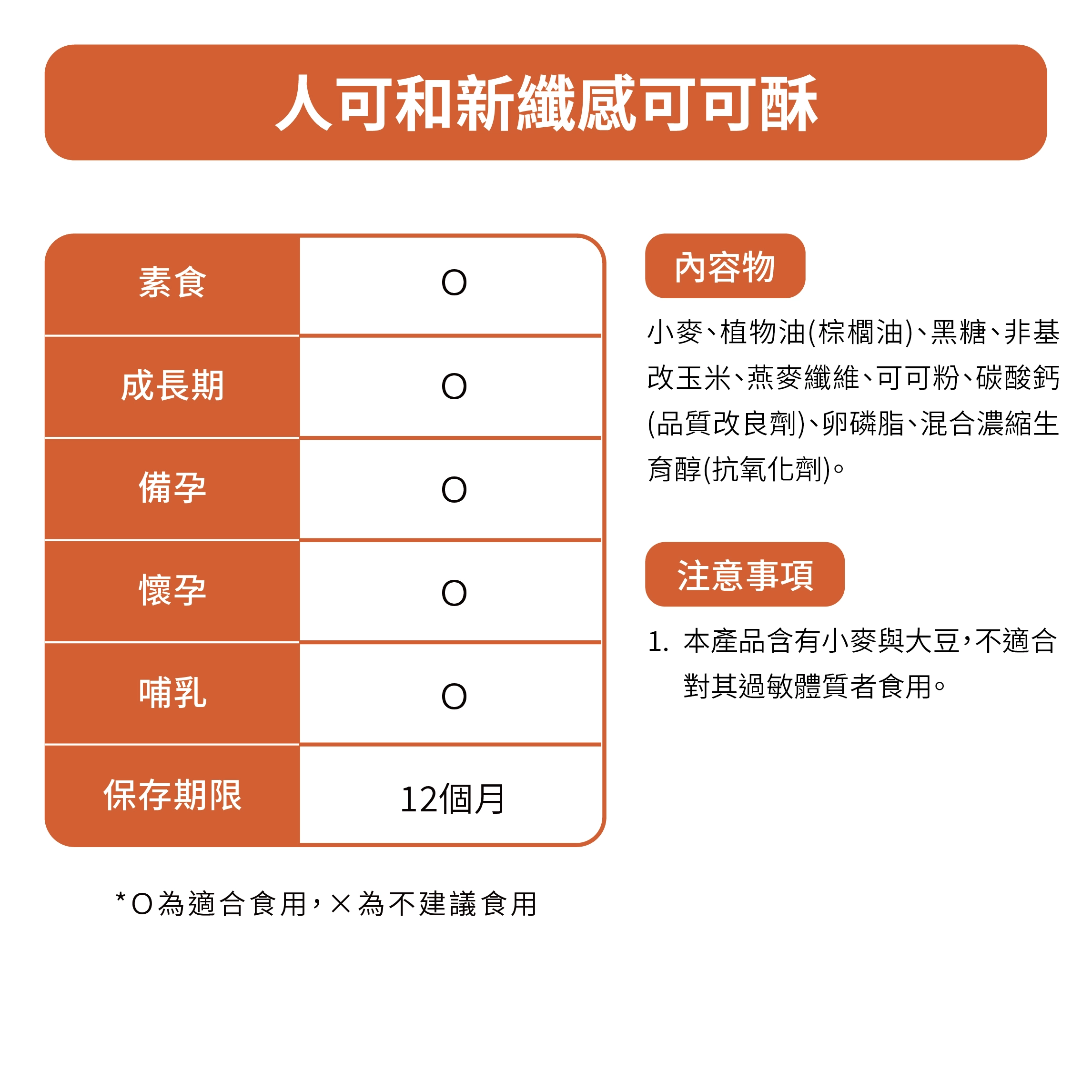 •內容物:小麥、棕櫚油、黑糖、非基改玉米、燕麥纖維、可可粉、碳酸鈣(品質改良劑)、卵磷脂、混合濃縮生育醇(抗氧化劑)。
